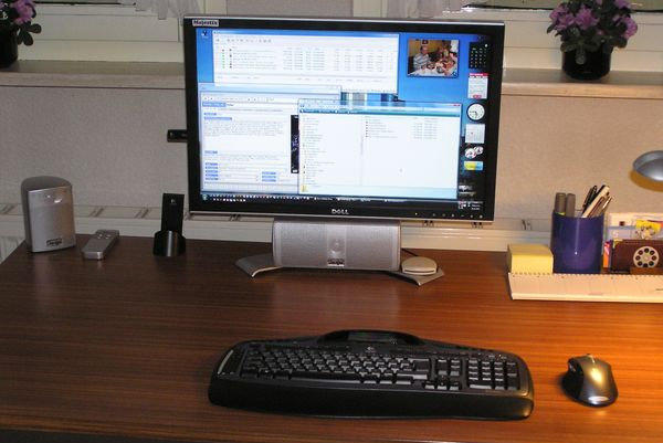 Athlon 64 X2 4600+ und 1700 GB Festplatten. Der Desktop ist ein Dell 24” Monitor mit Logitech MX 5000 Bluetooth Tastatur &