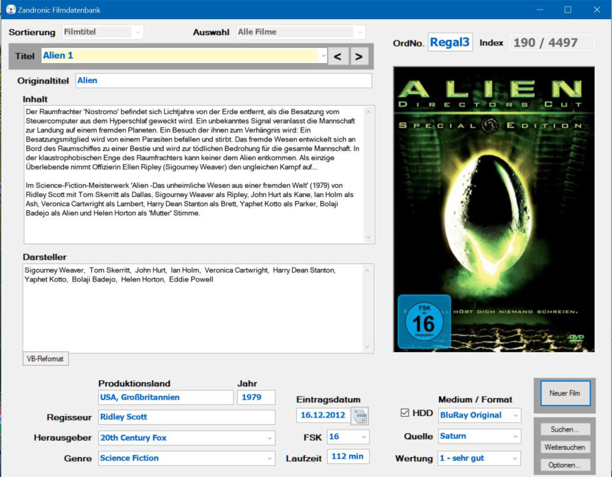 Ein weiteres Hobby ist das Anschauen von spannenden Filmen, zum Teil im Kino, auf VHS, auf DVD oder auf Blu-ray.Um den Überblick zu behalten habe ich eine Windows-Datenbank programmiert, in der alle gesehenen Filme festgehalten sind.Im unteren Beispiel ist der Film „Alien“ ausgewählt, den ich zuerst 1979 im Criterion Theatre am Broadway New York als Uraufführung gesehen hatte: